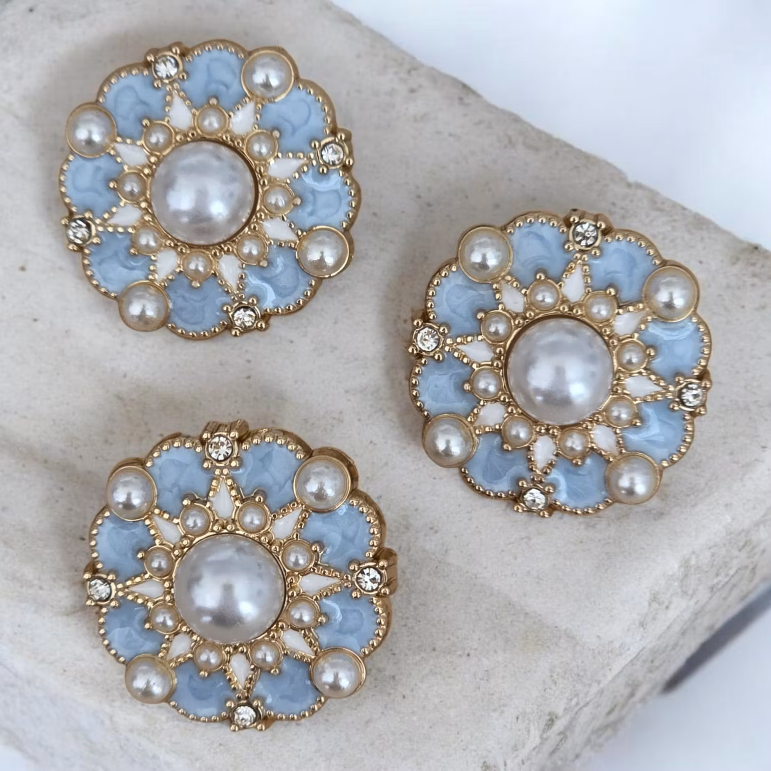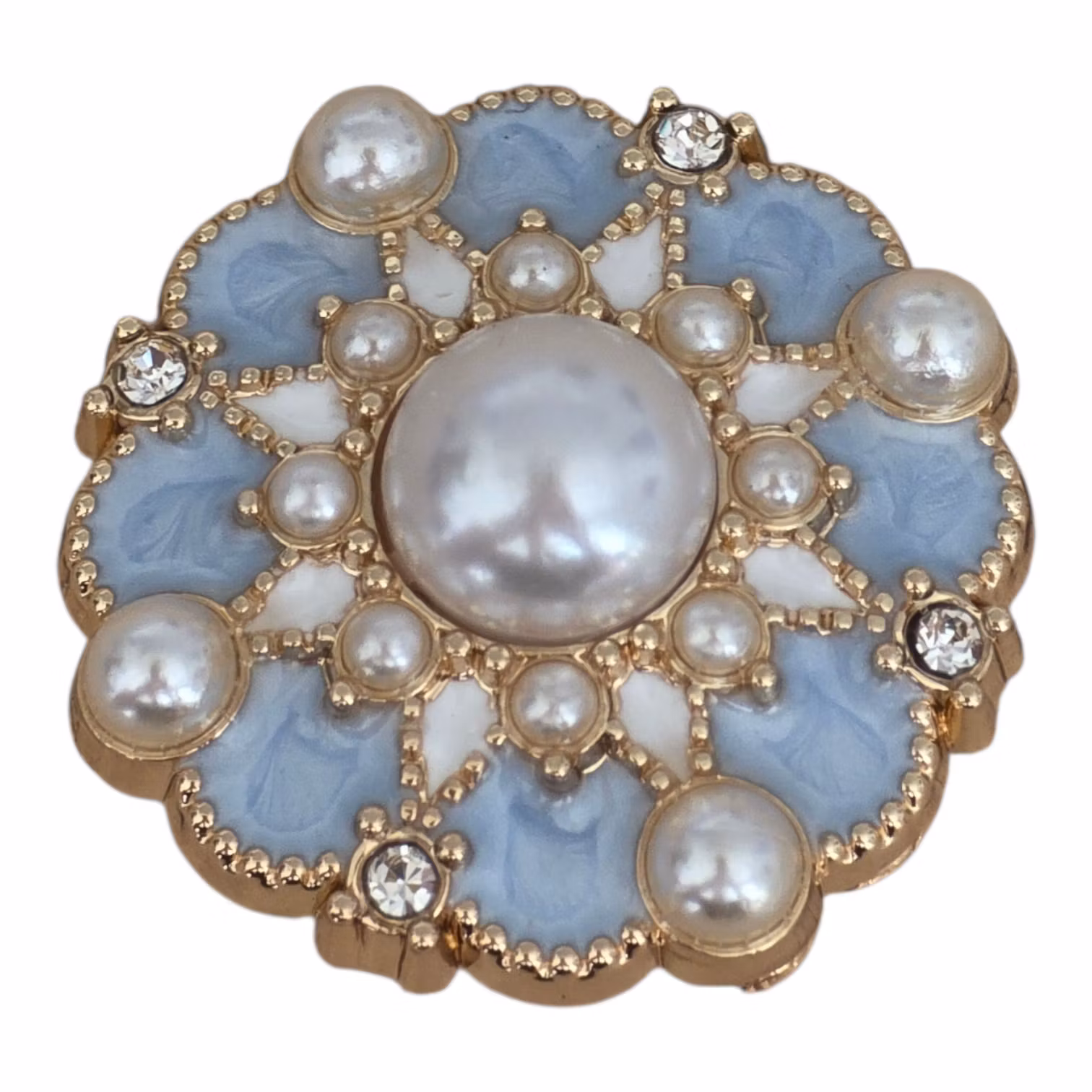 Ljusblå emaljknapp med vit pärla, gjord i mässig.