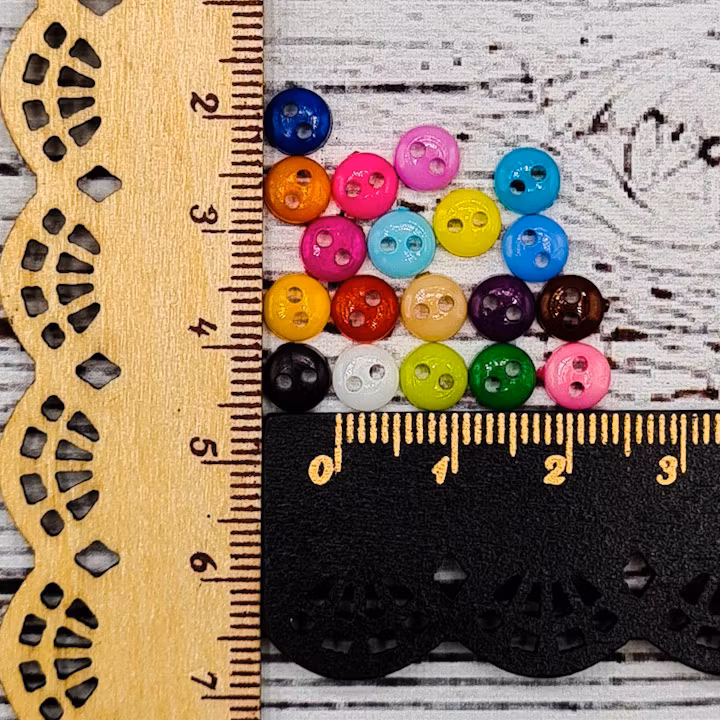 Storlek 5x2 mm. Knapparna har platt botten och lite bullig topp. Helt otroligt många färger att välja mellan NITTON stycken!Dockknappar!